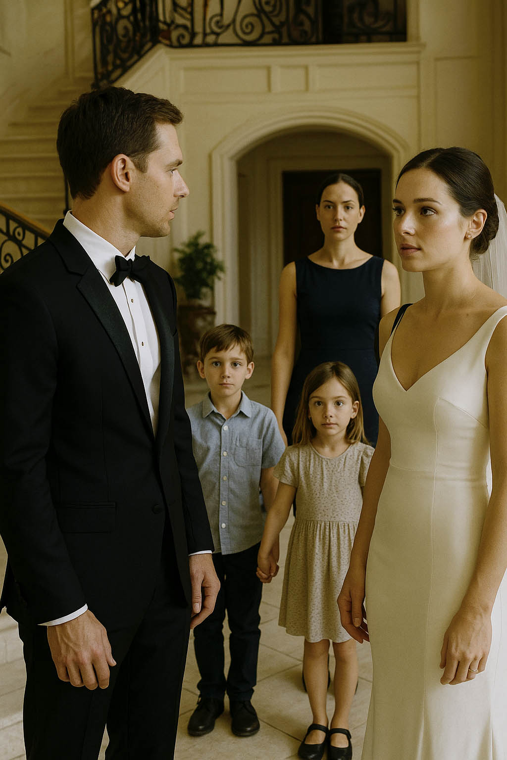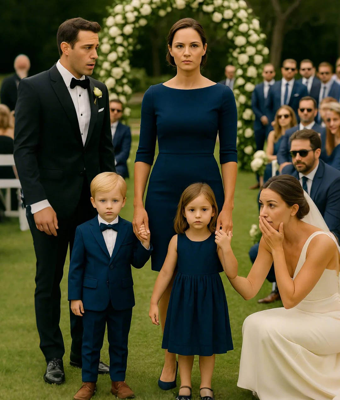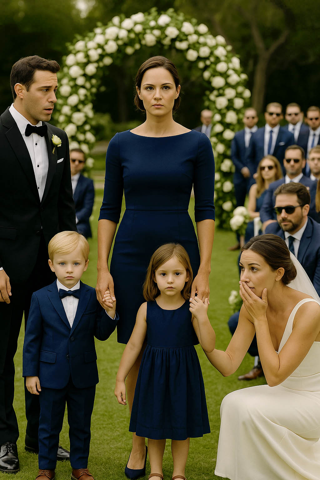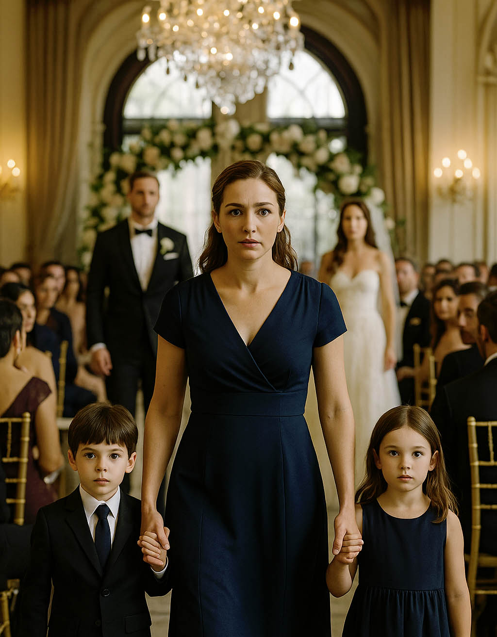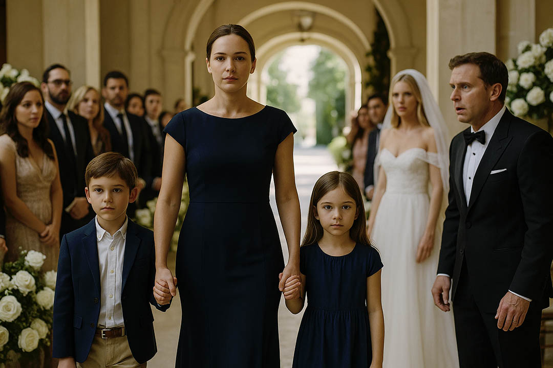 Puis il la vit : Léa, dans une robe bleu marine sobre et élégante, cheveux tirés en arrière… et deux enfants à ses côtés. Un garçon, une fille, visiblement jumeaux.