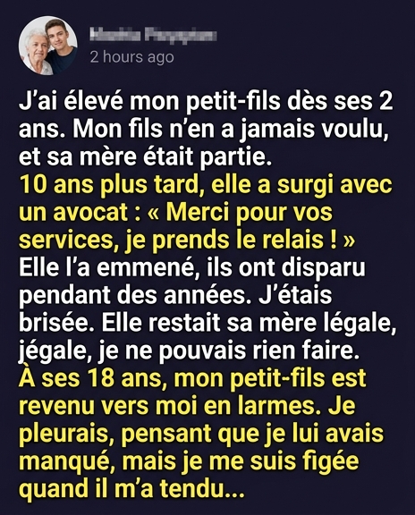 Il existe des liens que rien ne peut vraiment briser, même pas le temps, la distance ou les décisions des adultes. Certaines histoires rappellent que l’amour transmis au quotidien laisse une trace indélébile. La mienne est particulièrement bouleversante, car j’ai élevé mon petit-fils comme mon propre enfant… avant qu’on ne me l’enlève. Pendant des années, j’ai vécu dans le silence et l’absence, jusqu’au jour où quelqu’un a frappé à ma porte.