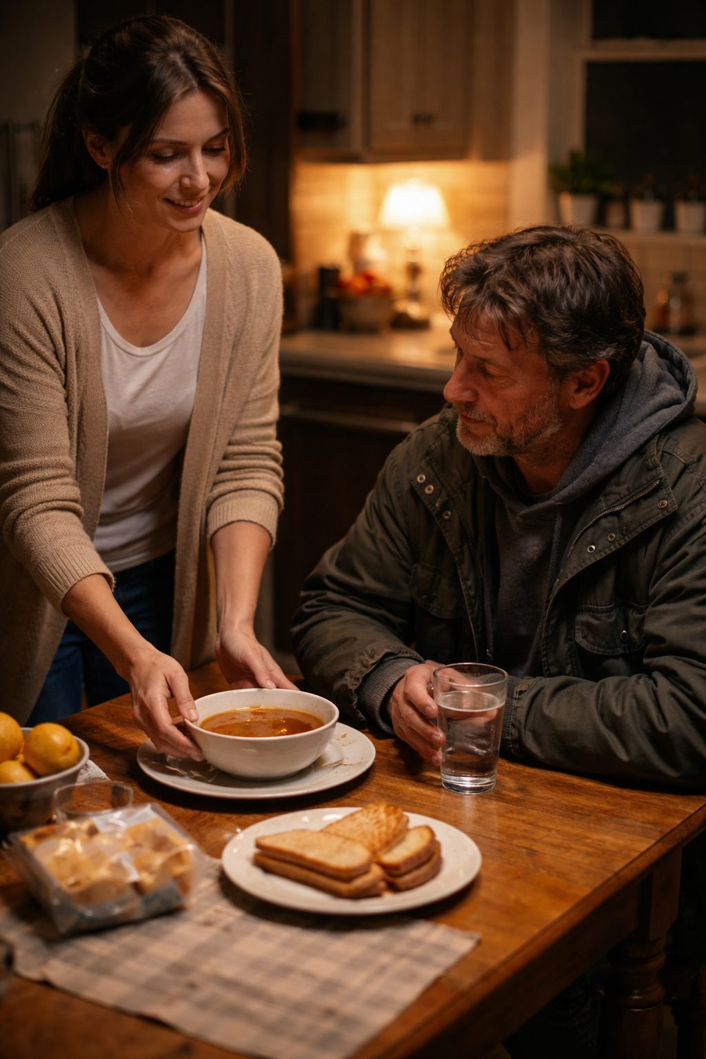 Les mots sont sortis avant que je les analyse vraiment. Il a hésité, méfiant, puis m’a suivie. Dans la cuisine, je lui ai préparé une soupe et un sandwich chaud. Rien d’extraordinaire. Juste un repas normal.