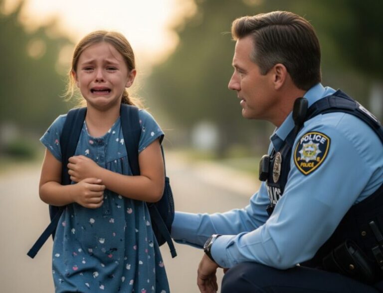 Ce matin-là, dans une rue calme d’un quartier résidentiel, personne ne s’attendait à voir une enfant bouleverser la routine des forces de l’ordre. La scène est saisissante : une fillette de 7 ans, les yeux pleins de larmes, courant à toute allure. Son visage fermé, son souffle court, ses pas précipités… Elle semblait fuir quelque chose, ou courir vers un appel à l’aide.