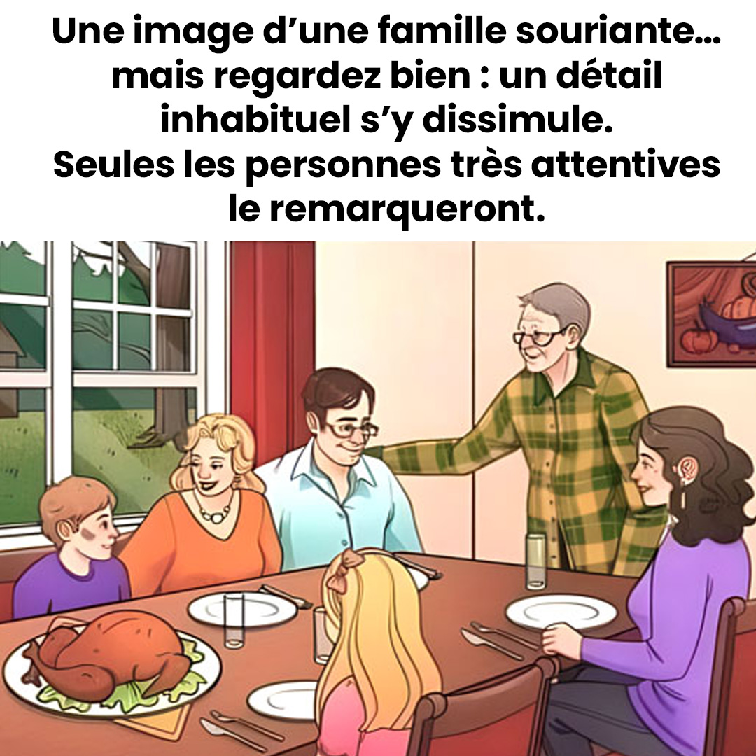 Imaginez une scène chaleureuse : une grande tablée, des rires, une volaille rôtie bien dorée au centre et toute une famille réunie autour d’un bon repas. L’ambiance semble parfaite. Et pourtant, un minuscule détail vient tout chambouler. Une anomalie visuelle s’est glissée dans l’image… Saurez-vous la trouver rapidement ? L’illusion est assez subtile pour passer inaperçue, même aux yeux attentifs.