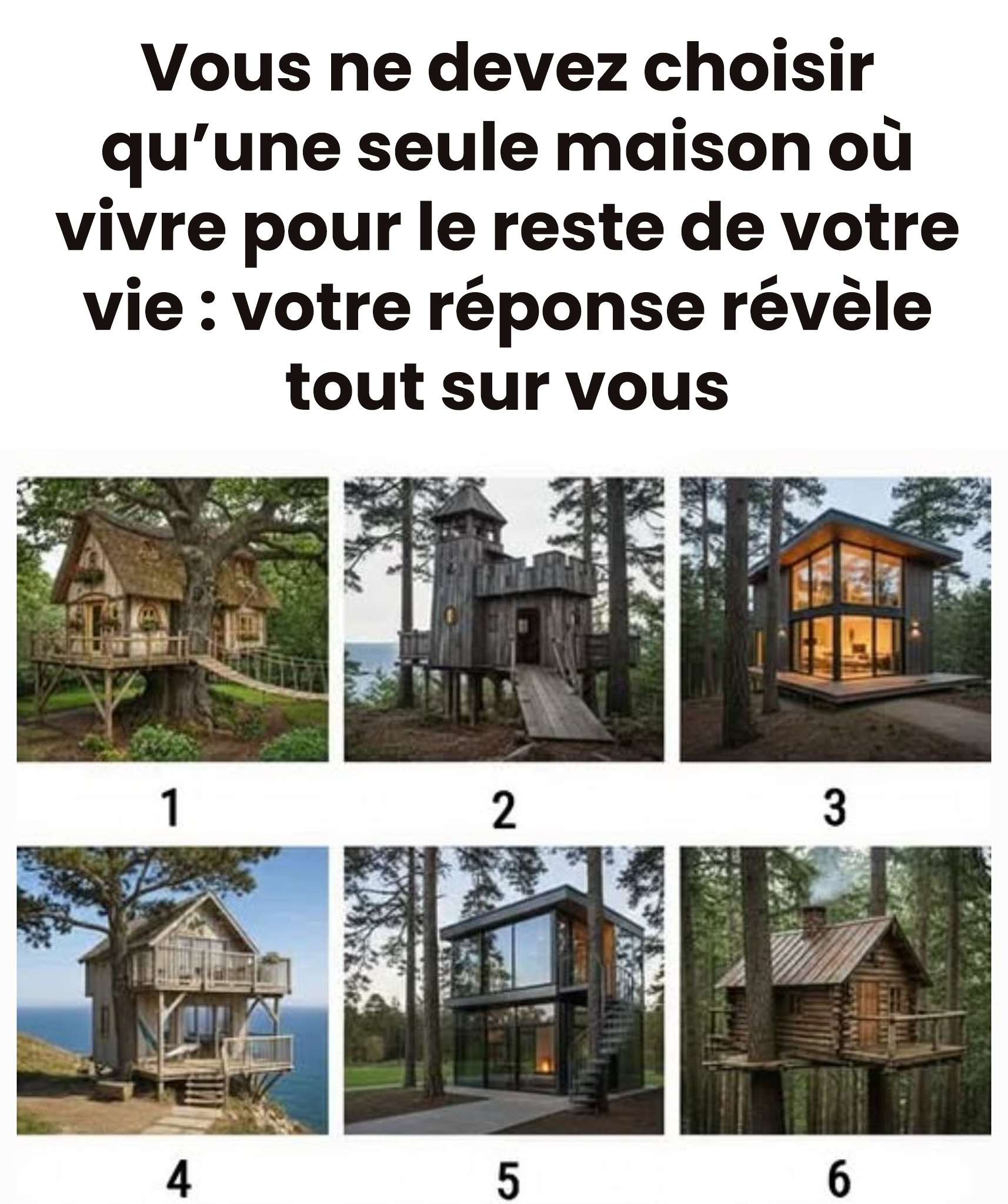 Et si tout se jouait en quelques secondes ? Pas besoin d’analyse compliquée ni de longues réflexions : juste une image, un choix instinctif… et beaucoup à découvrir sur vous-même. Imaginez la scène : vous devez choisir une seule maison, celle où vous vivrez pour le restant de vos jours. Pas de déménagement, pas de plan B. Celle qui vous attire immédiatement, presque sans raison. Intriguant, non ? Prenez une grande inspiration, laissez parler votre intuition… puis plongez dans les révélations.