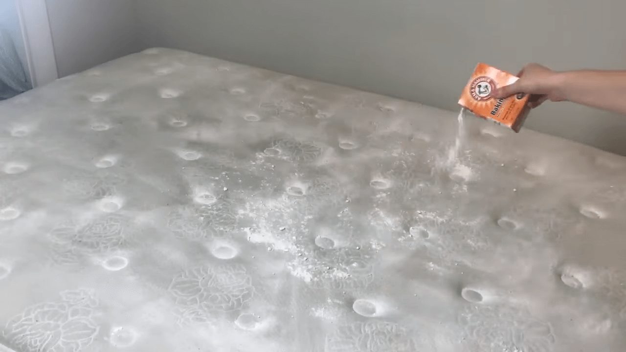 - Saupoudrez environ 125 g de bicarbonate de soude sur toute la surface du matelas.