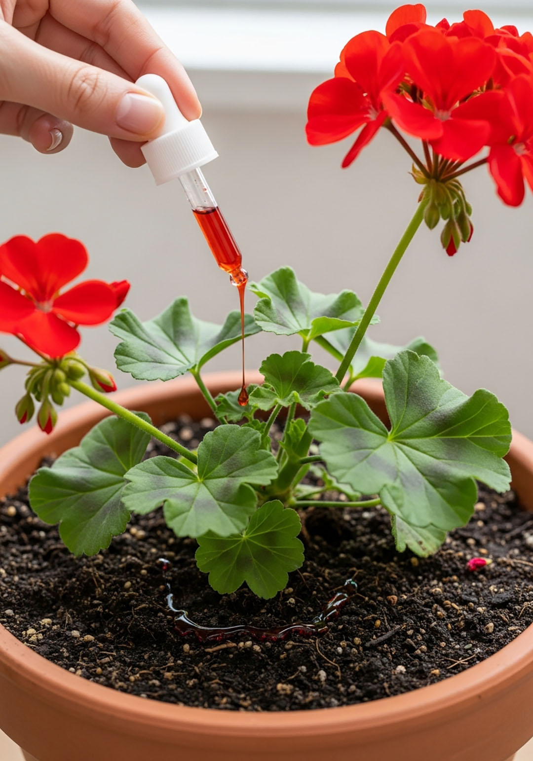 Un engrais pour plantes fleuries, utilisé en respectant scrupuleusement les doses indiquées, aide vos géraniums à fleurir plus longtemps. Inutile de surdoser : une plante trop nourrie développe surtout du feuillage, au détriment des fleurs.