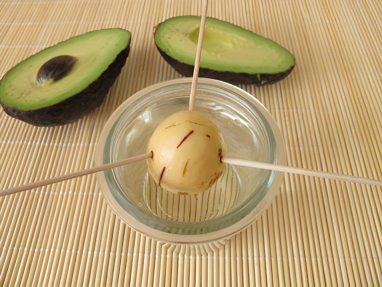 Après avoir mangé votre avocat, retirez le noyau. Passez-le délicatement sous l’eau tiède pour retirer la pulpe restante. Ensuite, identifiez les deux extrémités : le haut est pointu, le bas est plat ; c’est la partie à tremper dans l’eau.