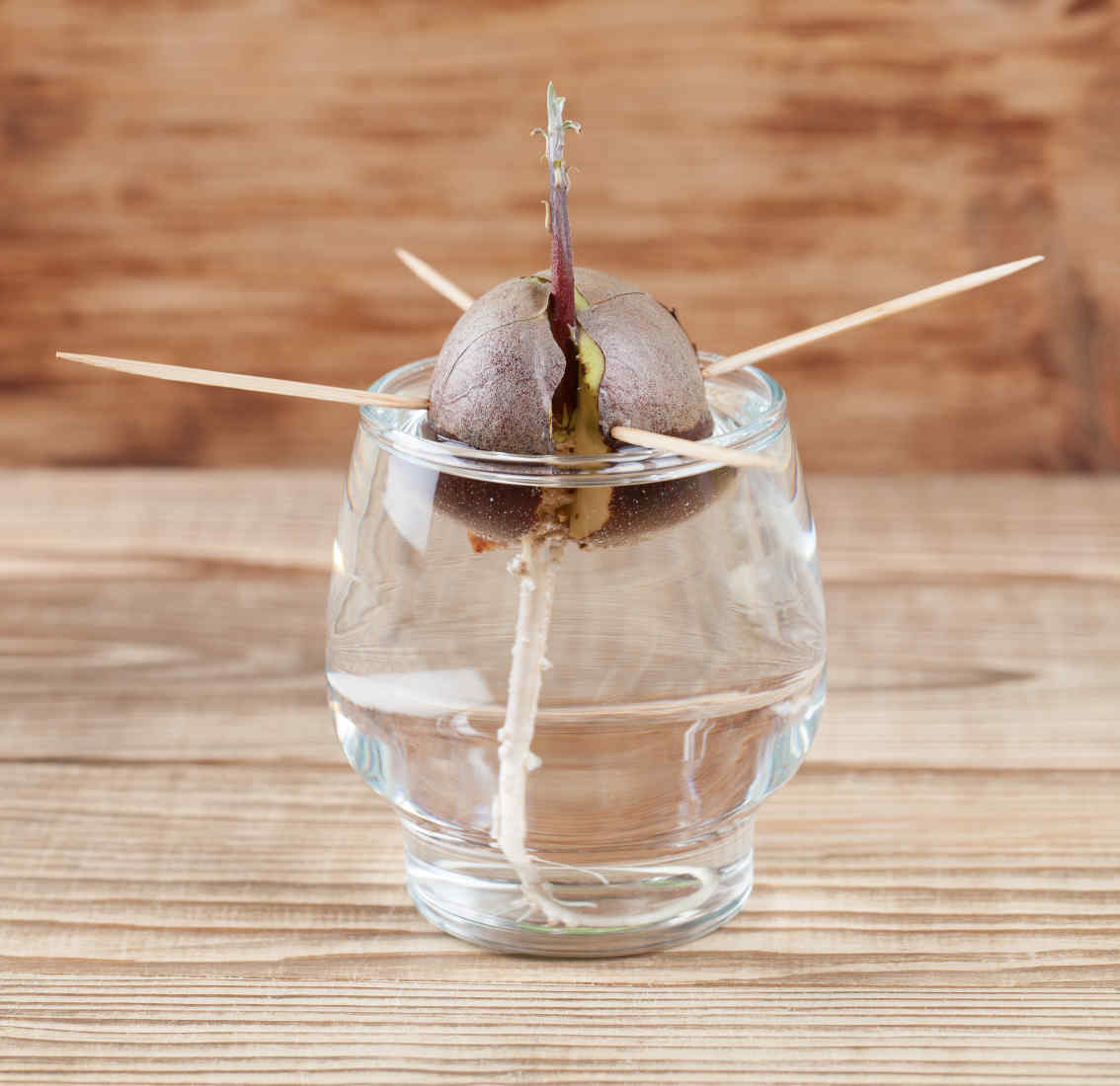 Prenez trois cure-dents en bois et insérez-les délicatement autour du noyau, de manière à ce qu’il repose sur le bord d’un verre rempli d’eau, le fond immergé. Il est préférable de choisir de l’eau à température ambiante et de la changer tous les deux ou trois jours. L’objectif est d’éviter la stagnation et la formation de moisissures.