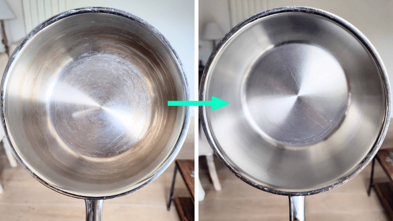 - Appliquez la pâte sur la zone à nettoyer (fond de casserole, parois, coins brûlés), puis :