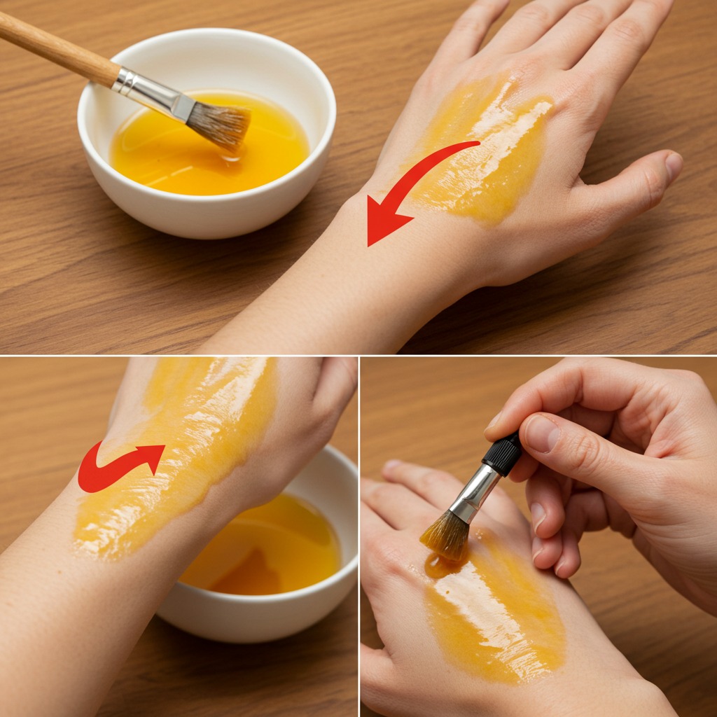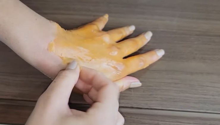 - Appliquez le masque tiède à l’aide d’un pinceau sur le dessus de vos mains.