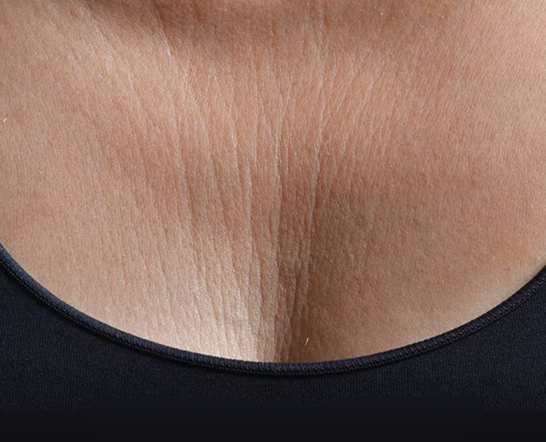 La peau du décolleté est plus fine et plus fragile que celle du visage. Elle contient moins de glandes sébacées, ce qui signifie qu’elle se déshydrate plus vite et perd plus facilement en élasticité. Ajoutez à cela le soleil, la position de sommeil, le manque d’hydratation ou certaines habitudes de vie, et vous obtenez une zone particulièrement sujette aux ridules et au relâchement cutané.