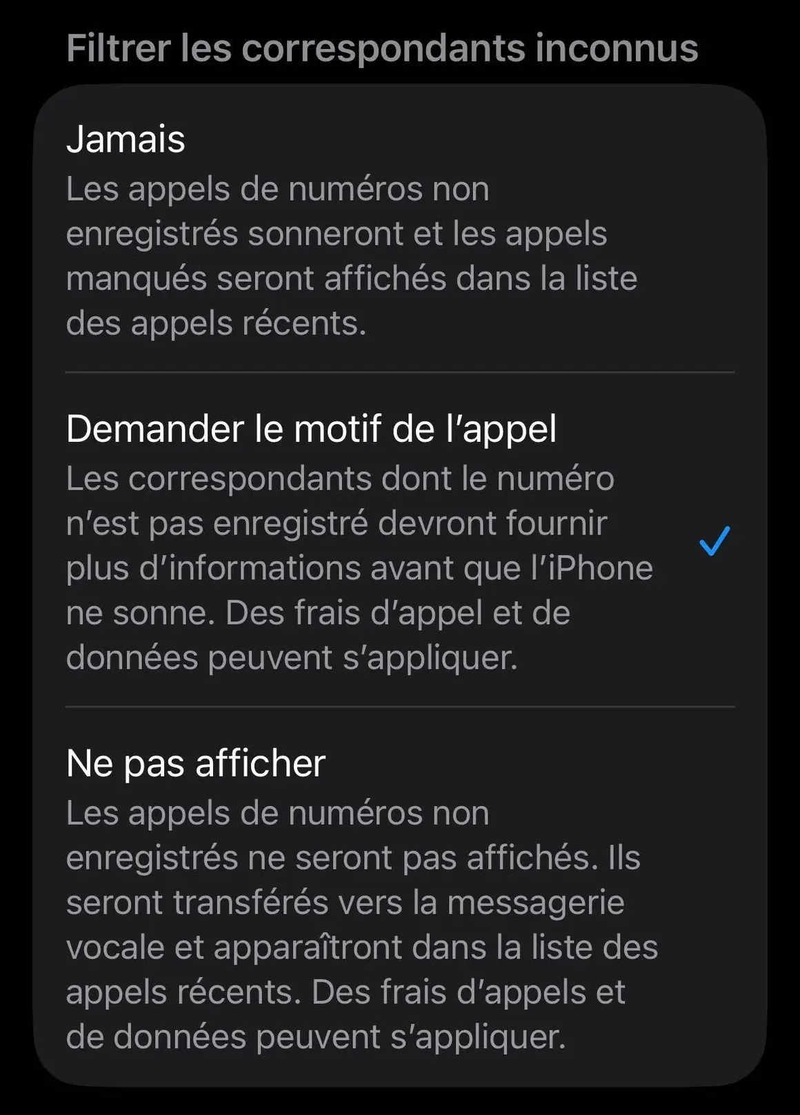 Selon le modèle d’iPhone, notamment à partir de l’iPhone 11, certaines options avancées peuvent ne pas apparaître, mais le filtrage de base reste parfaitement fonctionnel. Vous pouvez également activer un affichage distinct des appels inconnus pour les repérer plus facilement dans votre liste récente.