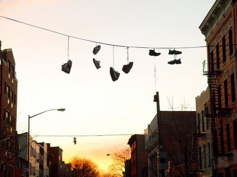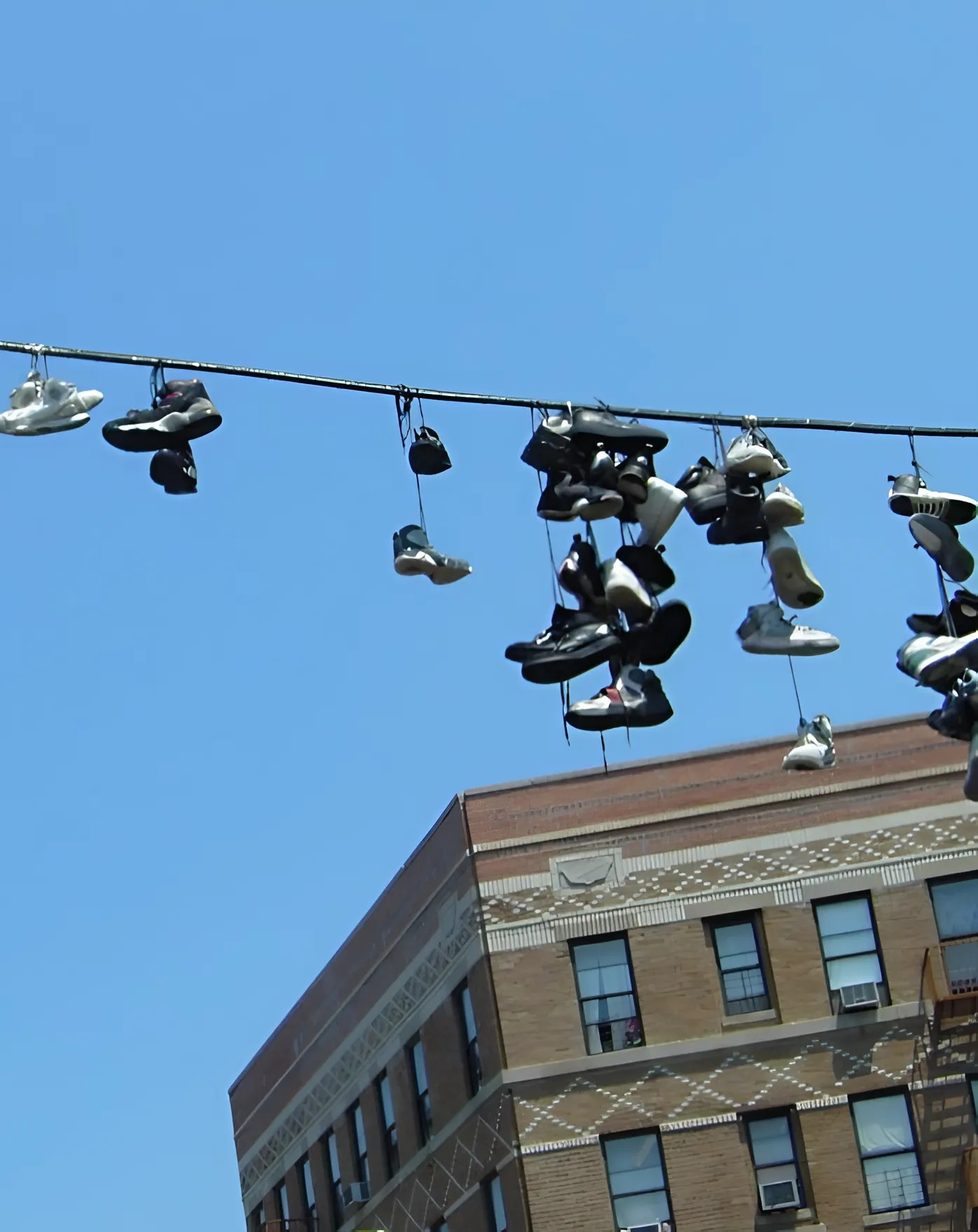 Plus fréquemment, il s’agit tout simplement… d’un défi entre amis ! « Tu penses que je peux les lancer par-dessus le câble ? » Et hop, une paire de Nike en altitude, témoin d’un moment de rigolade.