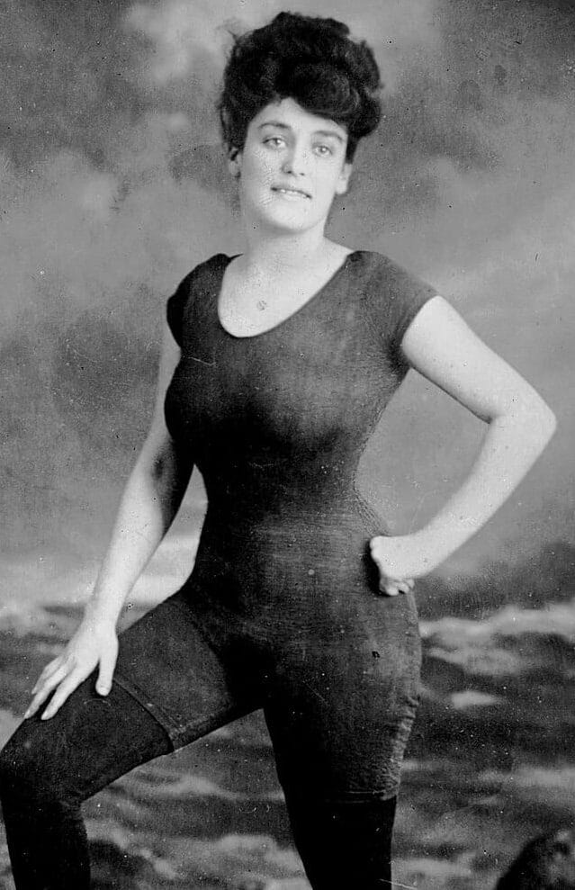En 1907, Annette Kellerman, nageuse australienne remarquable, ose porter un maillot une pièce moulant, laissant bras et jambes libres. Un choc pour l’époque ! On raconte même qu’elle fut arrêtée pour « tenue indécente » — mythe ou réalité, son geste restera un acte fondateur.