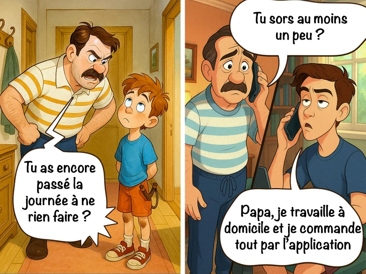 Traduction de texte sur image : Tu as encore passé la journée à ne rien faire ?/ Tu sors au moins un peu ? — Papa, je travaille à domicile et je commande tout par l’application.